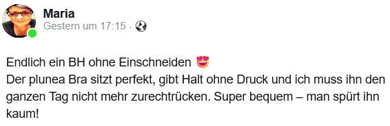 „Ich liebe einfach alles an diesem BH. Er ist sehr bequem und die blaue Farbe entspricht genau der Abbildung. Die Verarbeitung ist hochwertig, und die mehreren Reihen an Frontverschlüssen sorgen für einen sicheren Sitz. Außerdem bietet er hervorragenden Halt im Rücken. Ich bin mit meiner Wahl sehr zufrieden.“